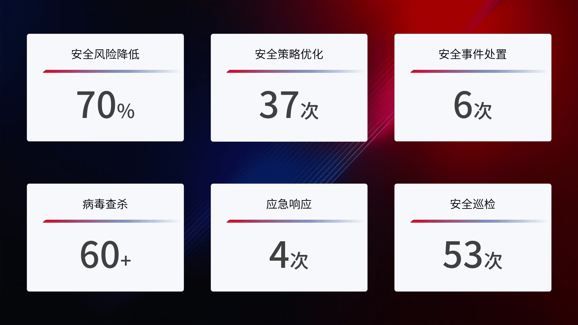 提供全面的安全事件报告体系,,,包括处置报告、、、、周报、、、、季度和年度总结,,,,结合持续监控,,帮助客户深入了解网络安全状况。。。
